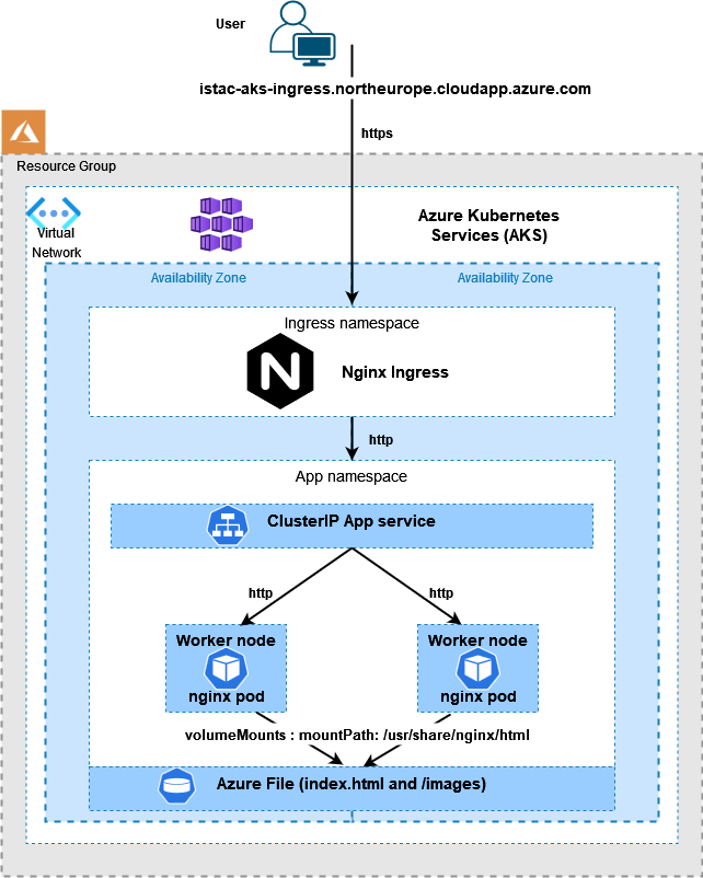 Note the use of subPath in the volumesMounts section, I did this so I would only require one Azure File share, one place to upload the index-*.html and images files.